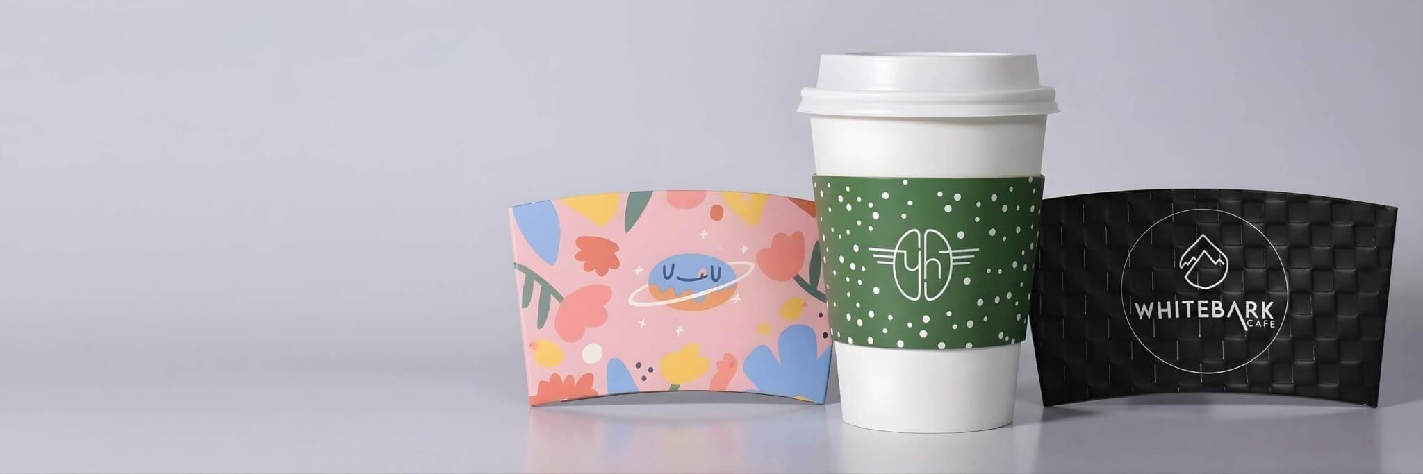 An array of custom-printed coffee sleeves featuring vibrant patterns, green logo designs, and textured black finishes on takeaway cups.