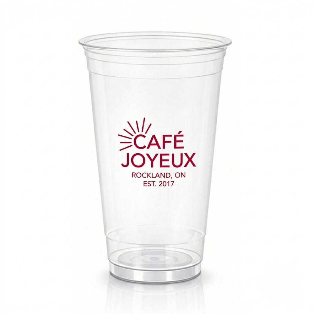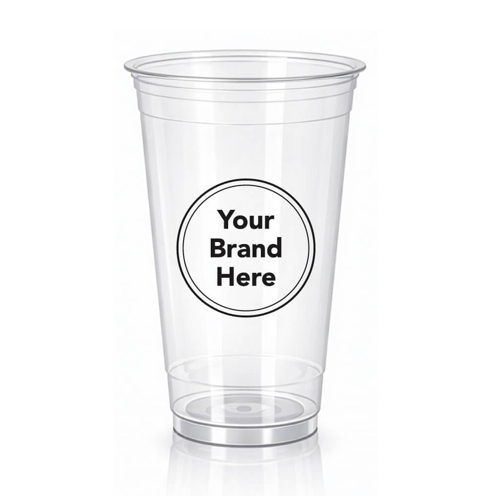 They are used for iced coffee, smoothies, juices, lemonades, and cold teas. They also suit layered drinks that are delicious. Most are suited for cold beverages. Some plastics can handle warmer liquids too. But these cups are typically chosen for iced service. Our 24oz cups are made from PET plastic (Polyethylene Terephthalate). PET is known for its clarity, food contact approval and its ability to be recycled.. Yes, customization is common. You can print a logo, a small tagline or a simple design that stays readable from a distance. Though our cups are considered disposable, they can in fact be used a few times. Please be sure to clean your cup well prior to additional uses. Yes our food service cups are made from BPA free materials and they are food safe. Yes, we do offer a variety of compatible lid as an add-on. Flat lids, dome lids, and straw-slot styles are common. Our minimum order for printed plastic cups is 1000 cups for each size ordered. We can provide you with samples of printed cups that we have printed for others. You can review these samples for print quality, size and overall feel and fit. Due to the nature of the printing process, we are unable to do small sample runs of your specific design. It holds 24 fluid ounces which is about 710 ml. Dimensions vary by style, especially for taper and lid fit, including many 24oz clear plastic cups.