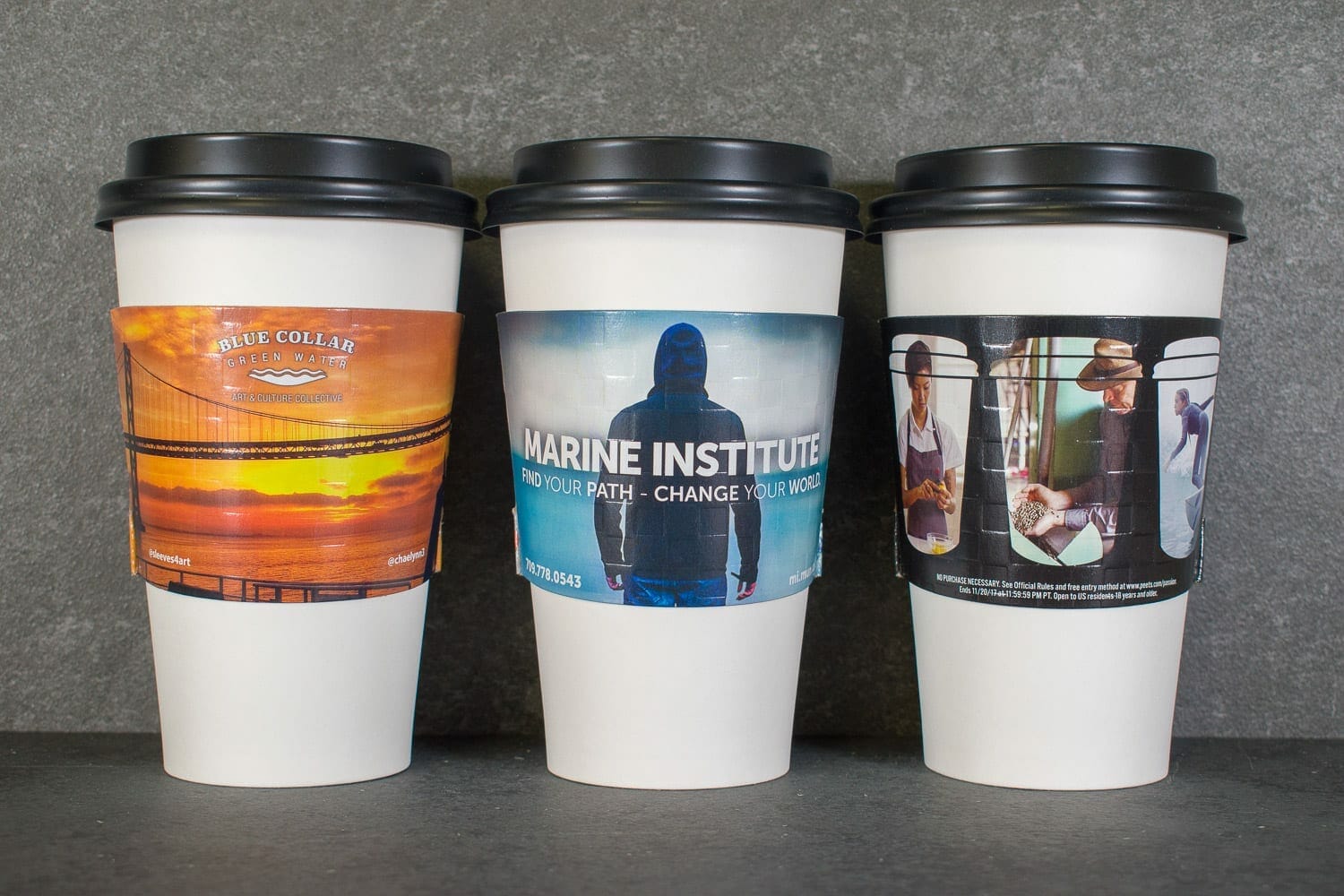 We will provide your customer with a paper choice. Choose our 23 pt Clay coated Newsback Paper (CCNB), made of 100% recycled paper. Or select our thicker corrugated material, which provides the highest insulation for hot cups. Sleeves will be printed on A-grade papers, which allow for sharp detail and richly saturated full-colour images. All our wholesale coffee sleeves are eco-friendly and 100% biodegradable.